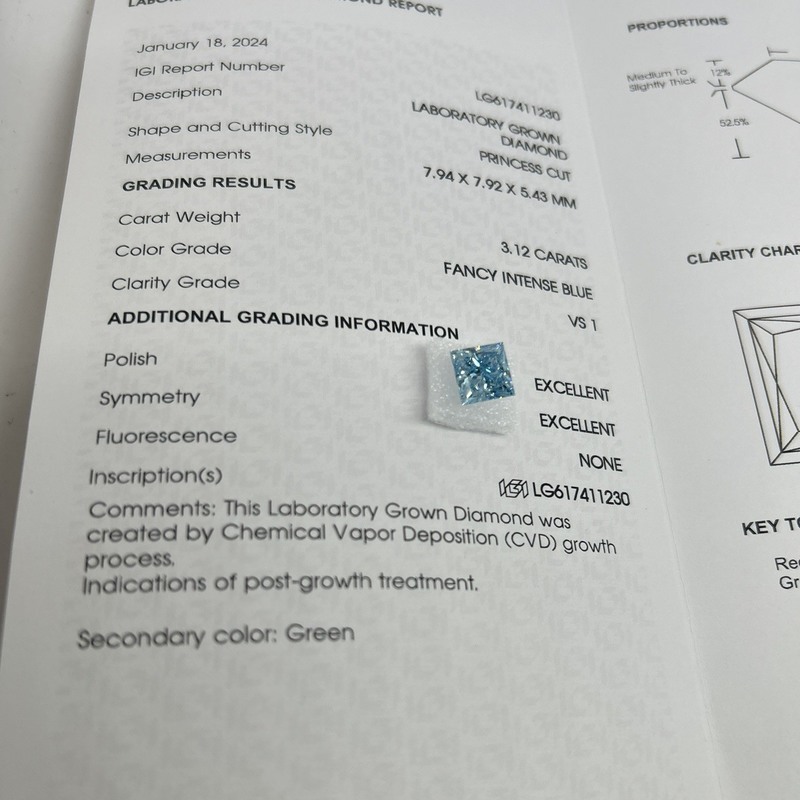 3.12CT ファンシー インテンスブルー VS1 2EX CVD ラボ成長ダイヤモンドプリンセスカット IGI証明書