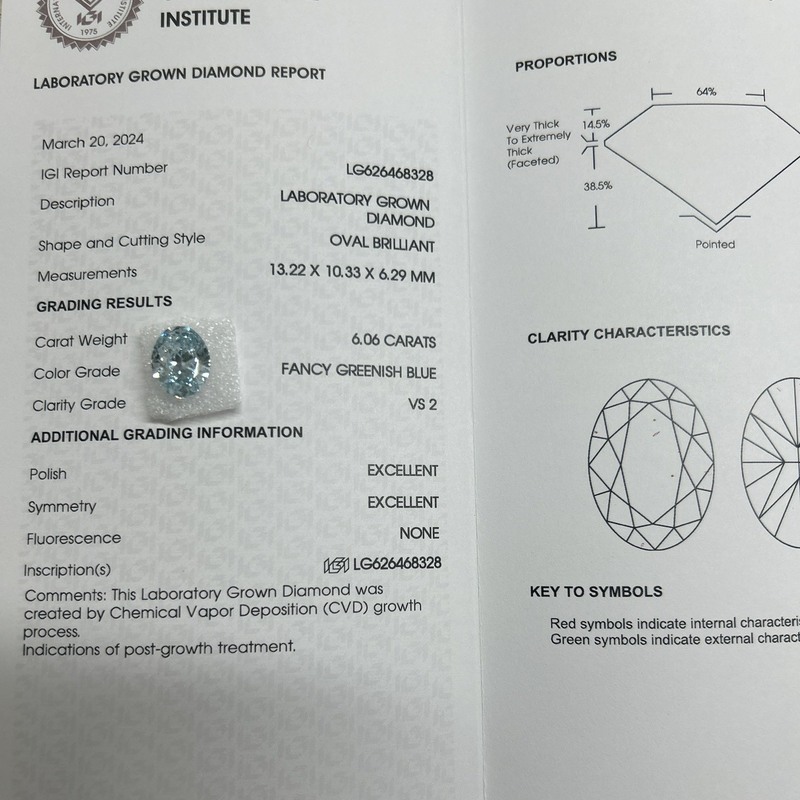 6.06ct ラボグルーム ダイヤモンド オバルカット CVD ファンシーグリーンシュブルー VS2 2EX N IGI 626468328